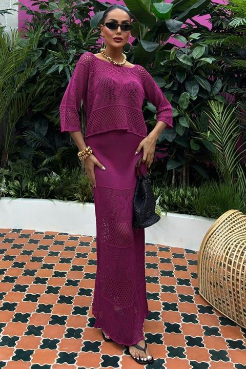 Boat Neck Half Sleeve Openwork Knitwear Suit 10093