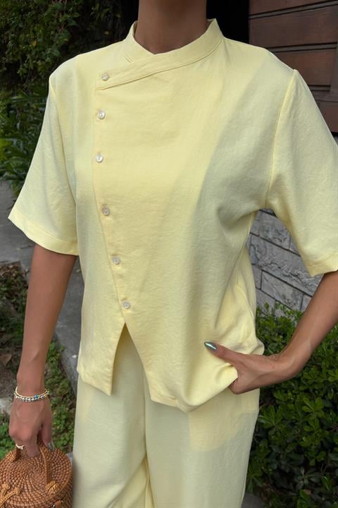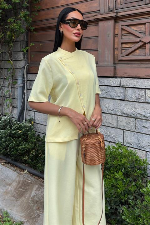 Grandad Collar Cross Button Plazzo Trousers Viscose Linen Suit 10209